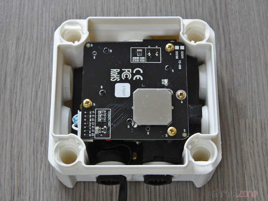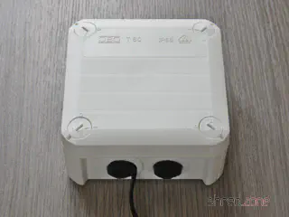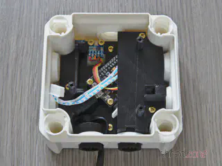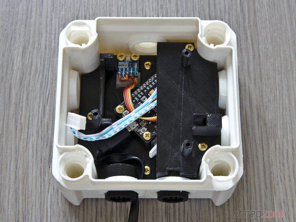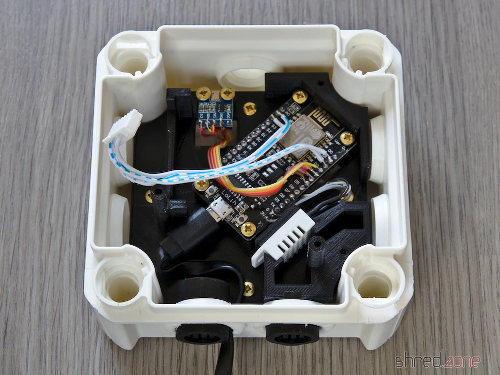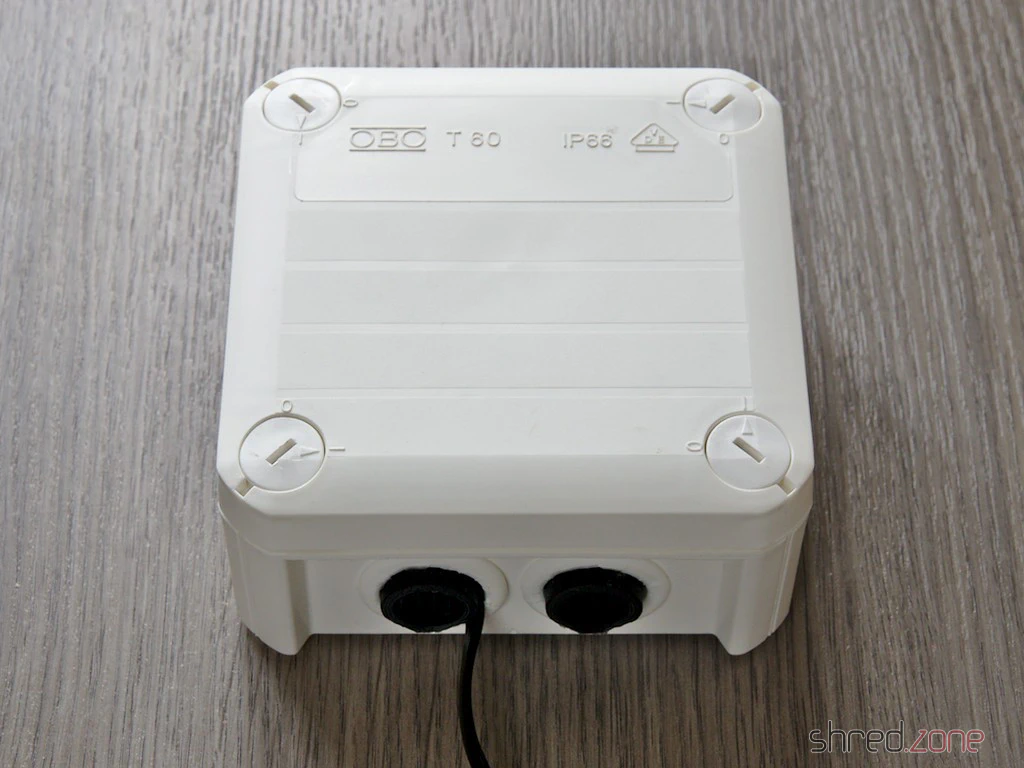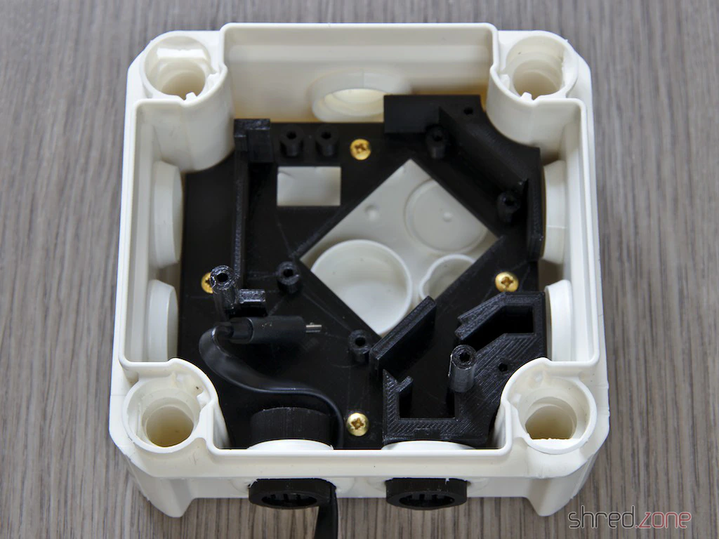 Der originale Bausatz benutzt zwei Kunststoffrohre als Gehäuse. Die sind preiswert und in jedem Baumarkt leicht zu bekommen, sehen allerdings nicht besonders ansprechend aus. Ich wählte stattdessen eine handelsübliche UV- und wetterfeste Außen-Abzweigdose als Gehäuse. Ein selbst konstruierter Rahmen aus dem 3D-Drucker wird dort hineingesetzt und die Elektronik darauf montiert.
