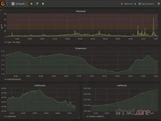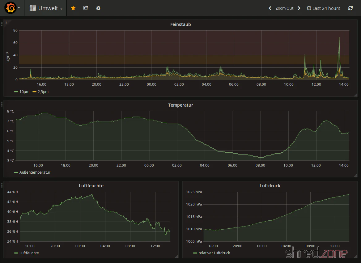 Nachdem man seinen Sensor bei luftdaten.info angemeldet hat, kann man die Messdaten in der Karte sehen und als CSV-Datei abrufen. Die aktuellen Messdaten können auch direkt per WLAN im JSON-Format abgefragt und beispielsweise in einer Datenbank abgelegt werden. Ich verwende ein selbst programmiertes kleines Tool, das die Daten regelmäßig abholt, in eine PostgreSQL-Datenbank ablegt und per Grafana darstellt.