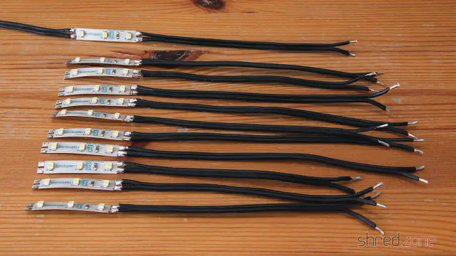 Als nächstes schnitt ich für jede Stufe einen 5 cm langen Streifen von der LED-Kette ab und lötete ein Kabel daran. Die Länge des Kabels ist so gewählt, dass das LED-Modul nachher etwa 20 cm von der Treppensäule entfernt einen großen Teil der darunter liegenden Stufe ausleuchtet. An der obersten und untersten Stufe leuchtet mit 40 cm Abstand außerdem noch ein weiteres Modul.