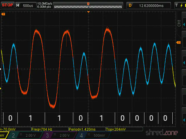 Kassetten waren dafür gedacht, Audiosignale wie Sprache oder Musik zu speichern, also mussten die Erfinder der Heimcomputer einen Weg finden, Daten in Audiosignale umzuwandeln. Der einfachste Weg ist, die Daten in einen Bitstrom aus 1en und 0en zu serialisieren und einen langen Rechteckwellenzyklus für “1” und einen kurzen Rechteckwellenzyklus für “0” zu erzeugen. Genau das macht der ZX Spectrum tatsächlich!