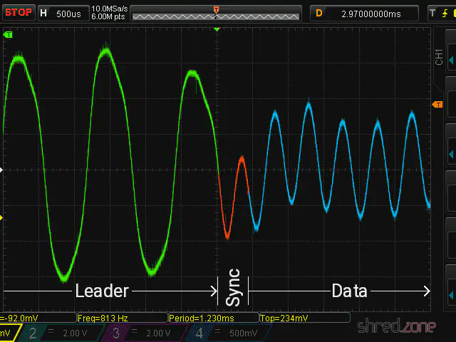 Aus diesem Grund beginnt die Aufnahme mit einem Vorlaufsignal (Leader), gefolgt von einem Synchronisationswellenzyklus (Sync), gefolgt vom eigentlichen Bitstrom. Das Vorlaufsignal ist lediglich eine kontinuierliche Welle mit einer Impulslänge von 2.168 T-States, was einen 806-Hz-Ton ergibt, der durch rote und cyanfarbene Ränder auf dem Fernseher angezeigt wird. Der Sync-Wellenzyklus ist ein Impuls von 667 T-States “an”, gefolgt von 735 T-States “aus”. Danach beginnt der eigentliche Datenstrom, der in blauen und gelben Randfarben angezeigt wird. Wenn das letzte Bit übertragen wurde, endet der Datenstrom einfach.