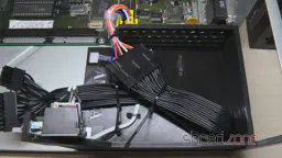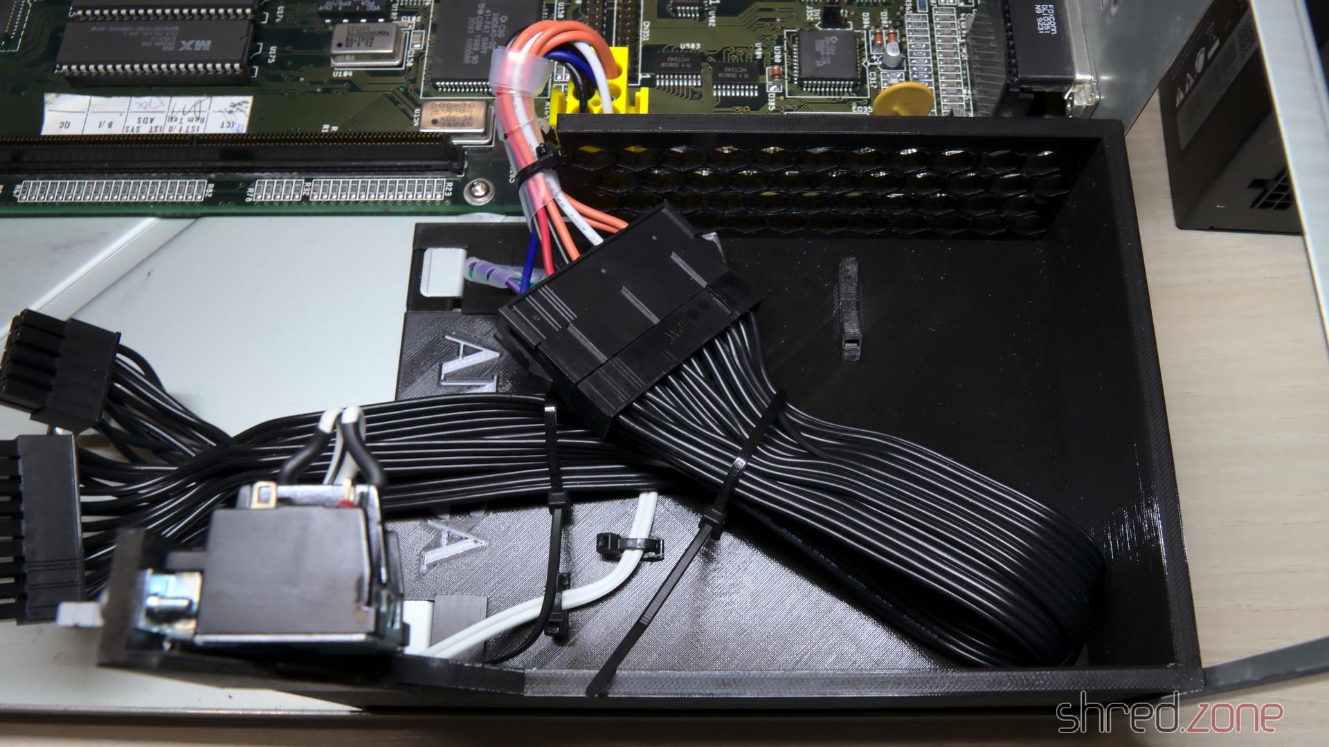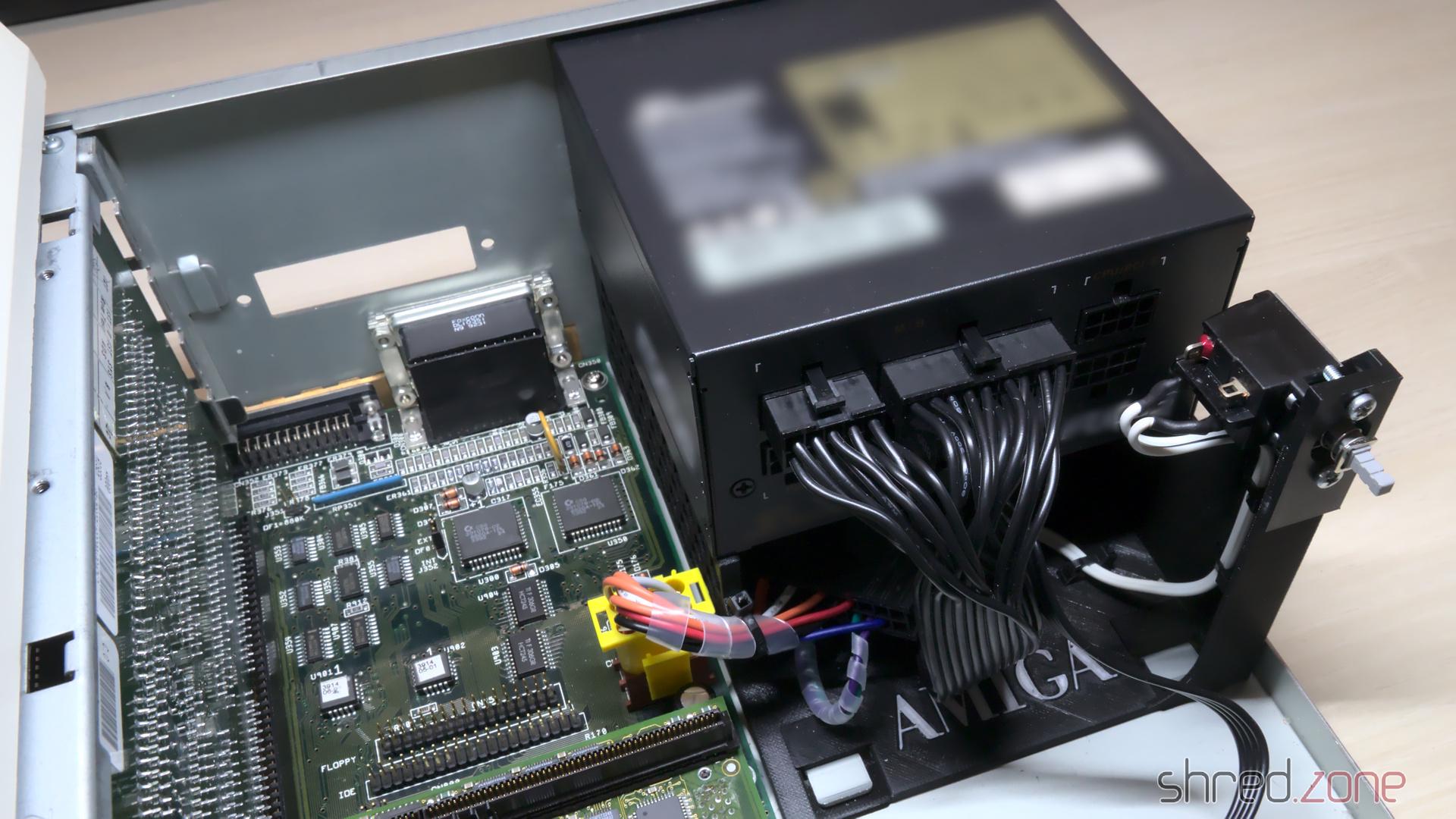 Überraschenderweise passt ein Standard-SFX-Netzteil perfekt in die Netzteilöffnung an der Rückseite des Amiga-Gehäuses. Sogar die beiden Schraubenlöcher des Gehäuses passen perfekt, fast so, als wäre der SFX-Formfaktor genau für diesen Zweck erfunden worden. Unter dem Netzteil ist ausreichend Platz für den Lüfter, um die warme Luft aus dem Gehäuseinneren nach draußen zu befördern. Es gibt auch genug Platz für den längeren SFX-L-Formfaktor. Die meisten davon verwenden einen leisen 120-mm-Lüfter. Es wird lediglich ein Rahmen benötigt, auf dem das Netzteil sitzen kann.