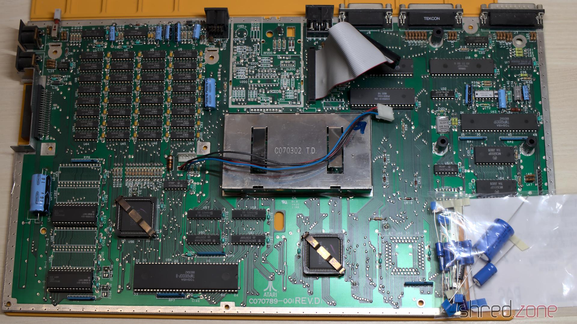 Das TOS befand sich in zwei seltsamen 96KB-ROMs. Um ein TOS-Upgrade durchzuführen, musste ich sie durch sechs (!) 27C256 EPROMs ersetzen. Das erforderte das Einlöten von vier weiteren Sockeln und das Ändern von drei Lötpads. Aber ich hatte ohnehin vor, die Elektrolytkondensatoren zu tauschen.