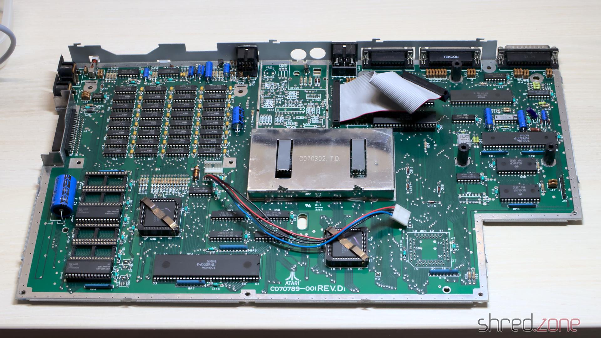 Für das Einlöten der Sockel musste ich zuerst die Pads öffnen. Da ich schon dabei war, öffnete ich auch gleich die Pads für einen Blitter-Sockel als Vorbereitung für das Hinzufügen eines Blitter-Chips. Ich habe diesen Plan jedoch nicht weiter verfolgt, nachdem ich die Preise für NOS-Blitter gesehen habe. 🤑 Laut dem Feedback von Atari-Enthusiasten ist der Blitter dank optimierter CPU-basierter Routinen ohnehin nicht wirklich notwendig. Das ist möglich, da der Blitter im Gegensatz zum Amiga die CPU während des Betriebs blockiert.