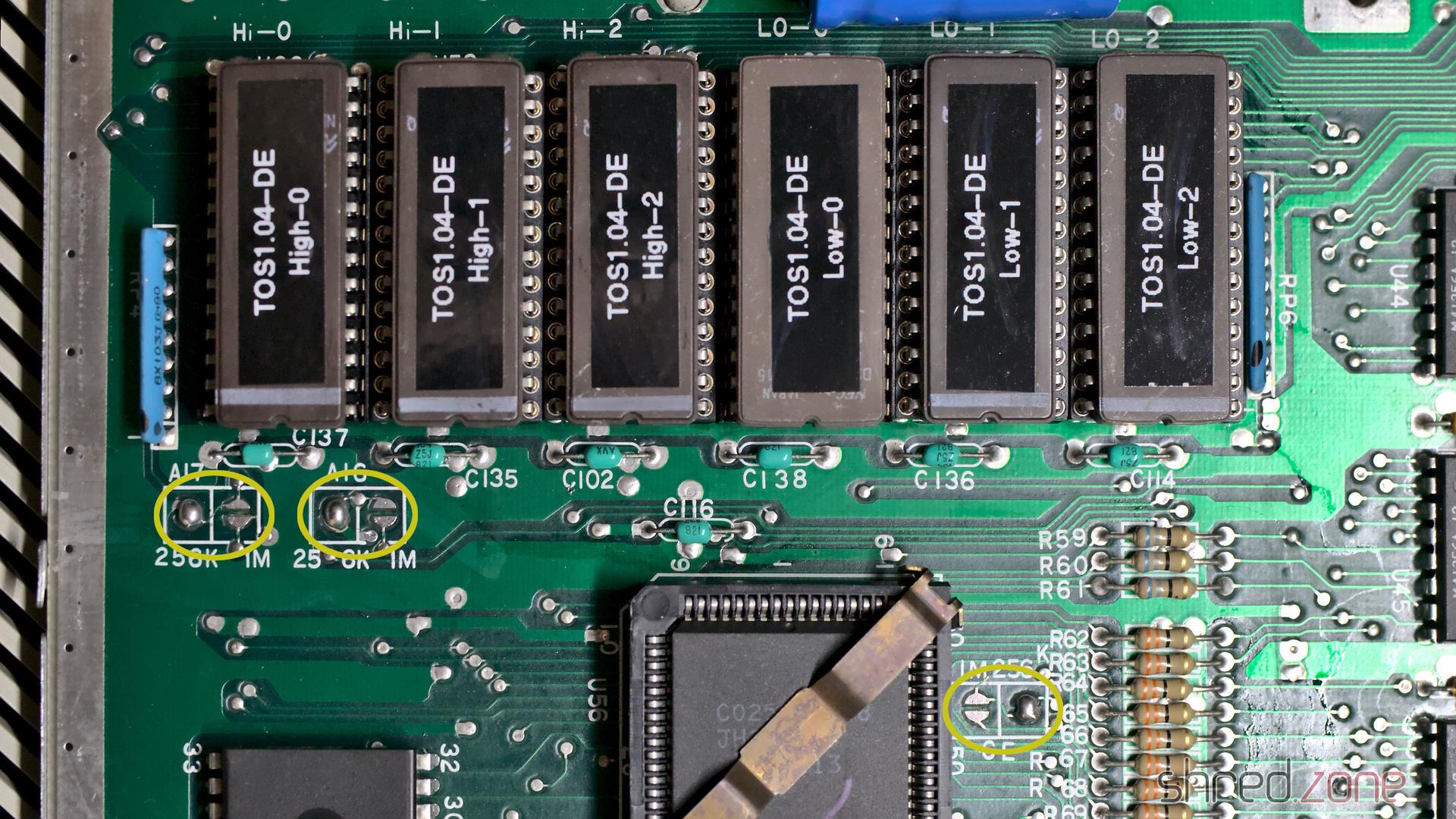 Das Rainbow TOS 1.04 Image wurde zuerst in eine obere und eine untere Hälfte aufgeteilt, und dann wurde jede Hälfte wieder in drei Abschnitte aufgeteilt. Dafür habe ich mein Tool pynaroma verwendet und dann jeden Abschnitt auf ein 27C256 EPROM gebrannt, was sechs EPROMs ergab. Beim Wechsel von zwei ROMs zu sechs EPROMs ist es außerdem notwendig, drei Lötpads von der „1M“- auf die „256K“-Konfiguration umzustellen.