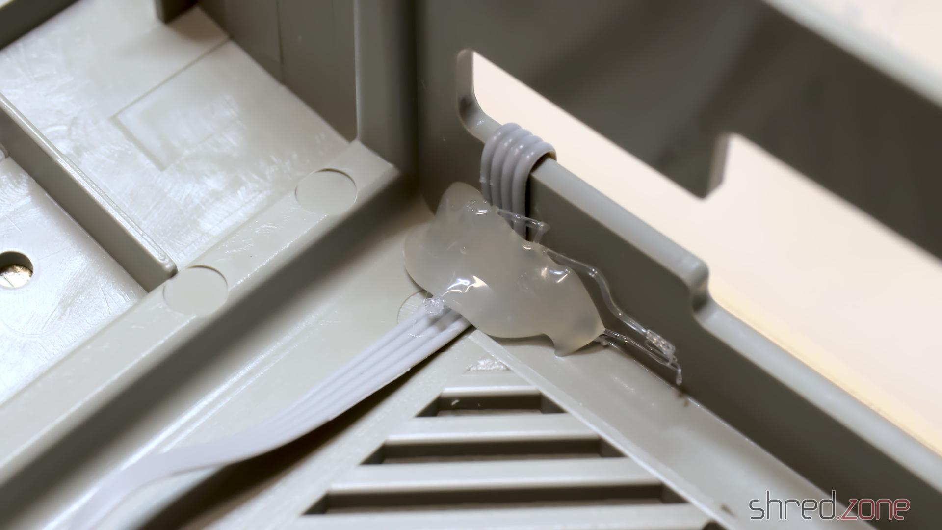 Das OLED-Display ist mit doppelseitigem Klebeband an der Gehäuseoberseite befestigt. Das Flachbandkabel wird dann im Inneren mit Heißkleber verklebt, damit es schön fest sitzt.