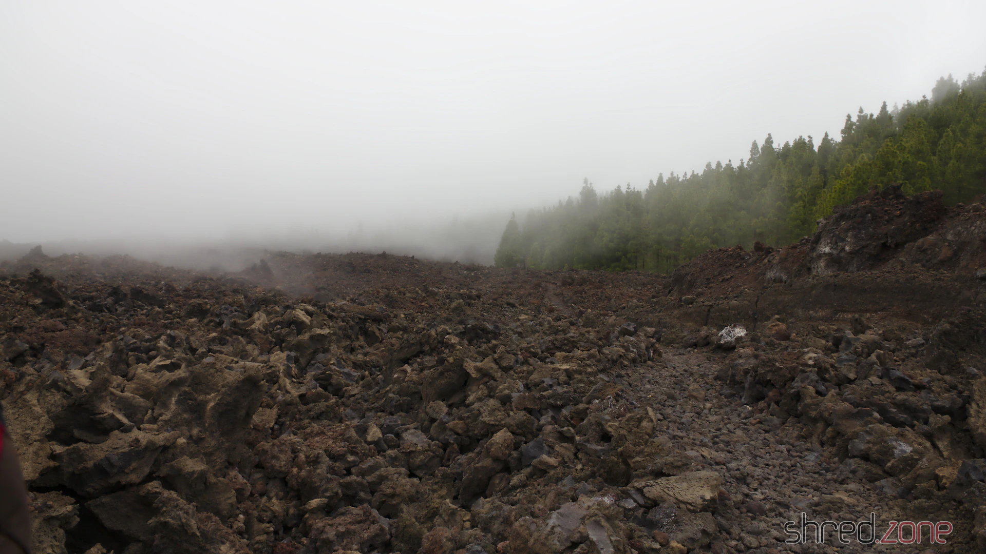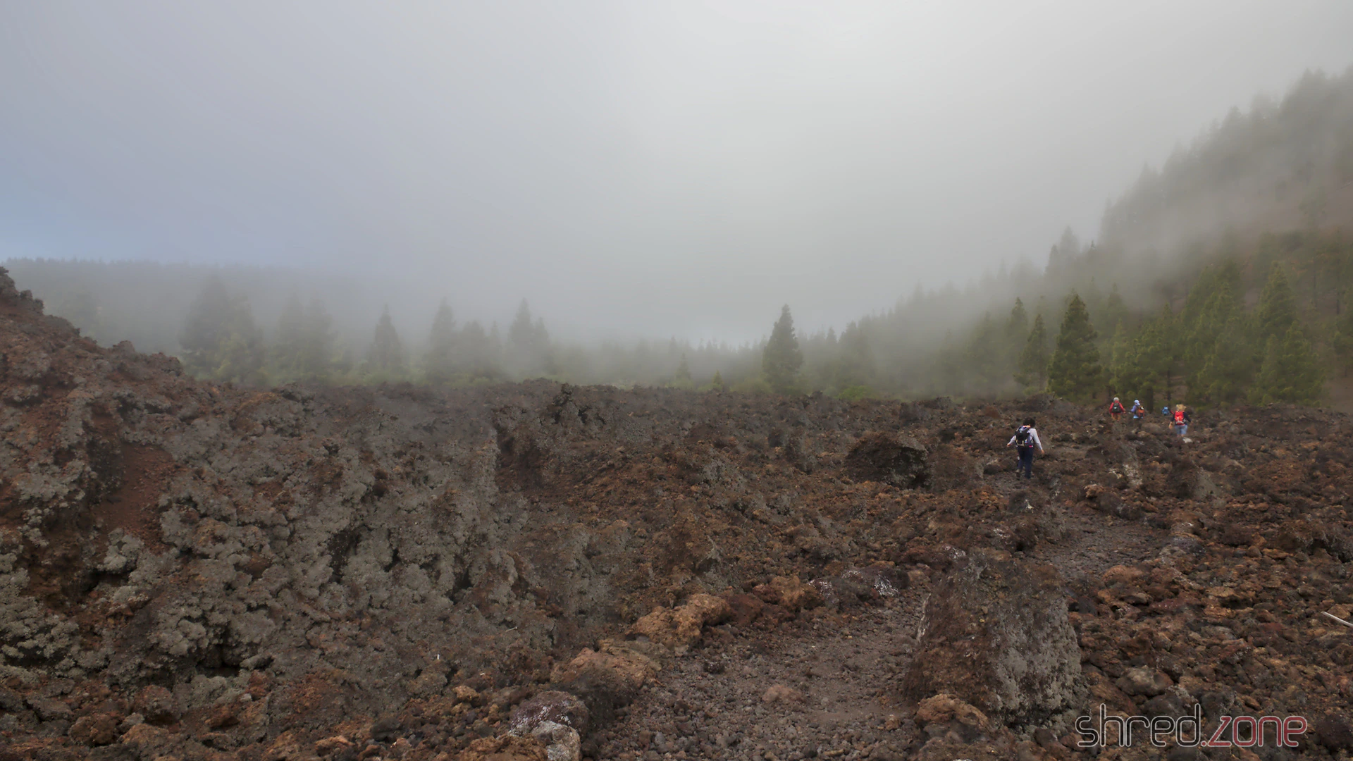 Normalerweise liegt dieser Ort über den Wolken. Dieses Mal waren die Wolken ziemlich hoch und bedeckten die Landschaft mit einem dichten Nebel. Es war sehr spektakulär. Auf der Ebene aus vulkanischem Gestein fühlte es sich an, als würden wir auf einem fremden Planeten wandern.