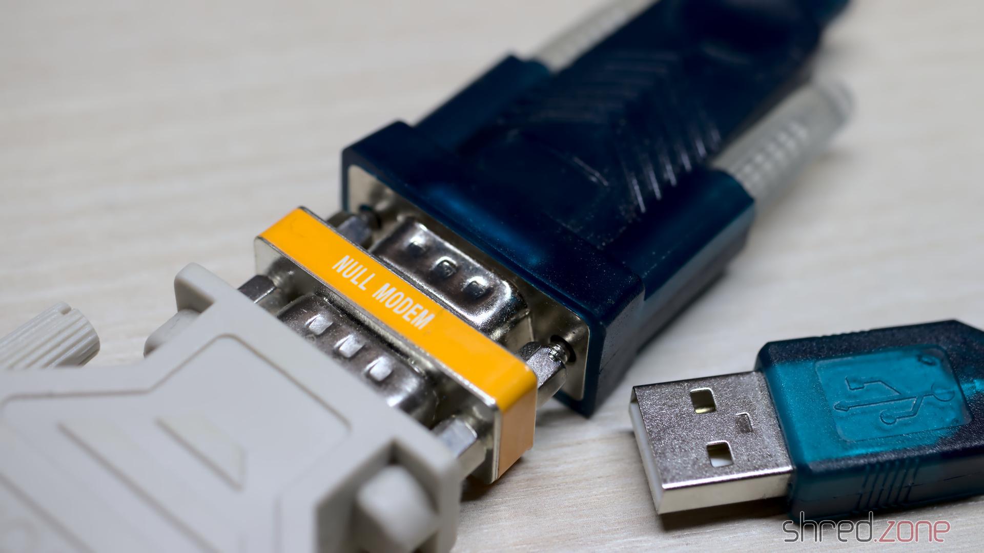Hardwareseitig benötigst du eine Konstruktion mit einem weiblichen DB25-Anschluss an dem einen Ende und einem USB-Stecker an dem anderen Ende. Ich benutze einen dieser USB-zu-Seriell-Konverter, die in Hardware-Shops für wenig Geld zu finden sind. Sie sind oft mit einem männlichen DB9-Stecker ausgestattet und sollen an Peripheriegeräte (wie Modems) angeschlossen werden. Um sie mit einem Computer zu verbinden, wird ein sogenanntes Nullmodem benötigt, was einfach ein kleiner Adapter ist, der es ermöglicht, zwei Computer direkt miteinander zu verbinden, indem die Sende- und Empfangsleitungen gekreuzt werden. Schließlich brauchen wir einen DB9-zu-DB25-Stecker mit den richtigen Geschlechtern, um das andere Ende des Nullmodems mit dem Amiga zu verbinden.