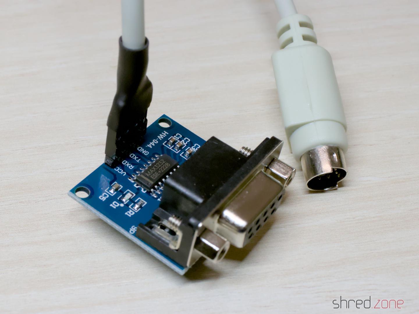 Um einen Adapter zu bauen, benötigst du ein PS/2-Kabel (z.B. von einem Verlängerungskabel oder einem alten PS/2-Eingabegerät) und einen auf MAX3232 basierenden TTL-zu-DB9-Pegelwandler. Diese Wandler findet man auf Online-Marktplätzen für wenige Euro.