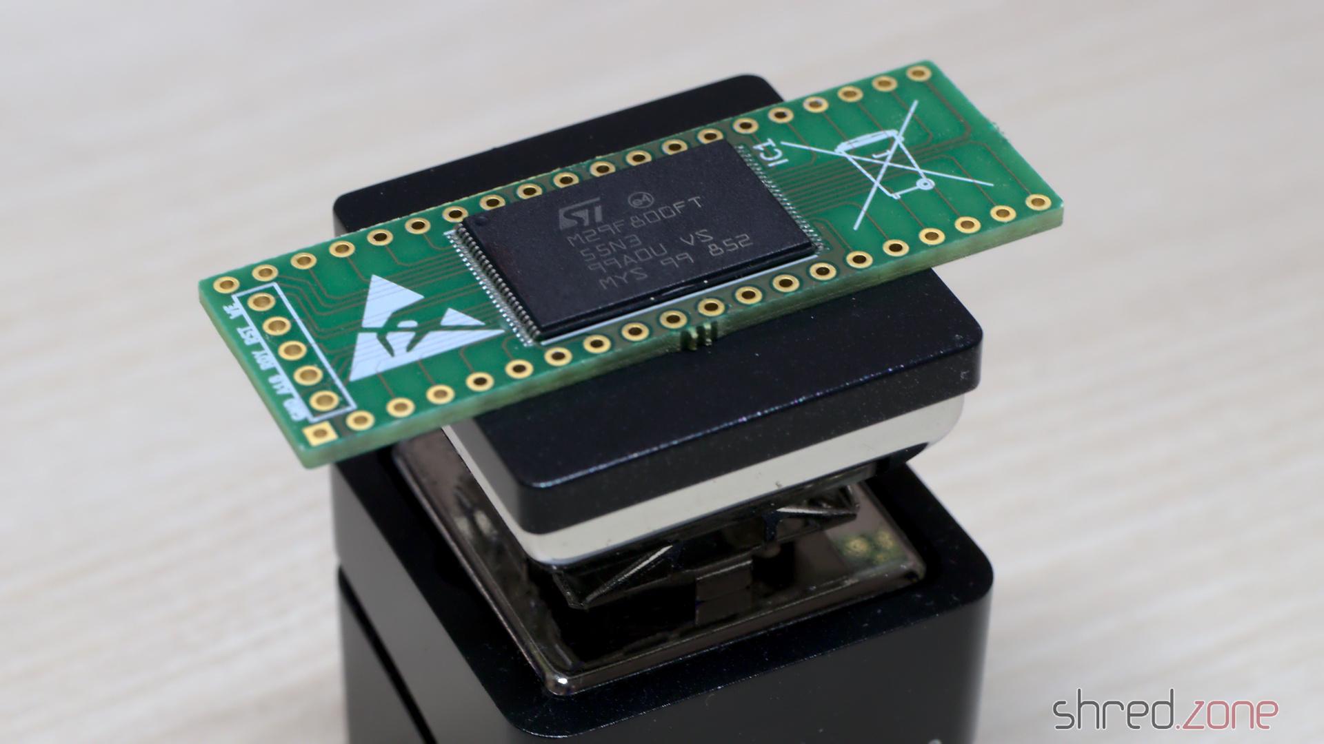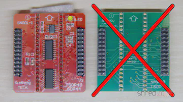 Beachte, dass du das aktive Base Board (SN001, rot auf dem Foto) benötigst. Das Standard-TSOP48-Base-Board (grün) funktioniert hier nicht.