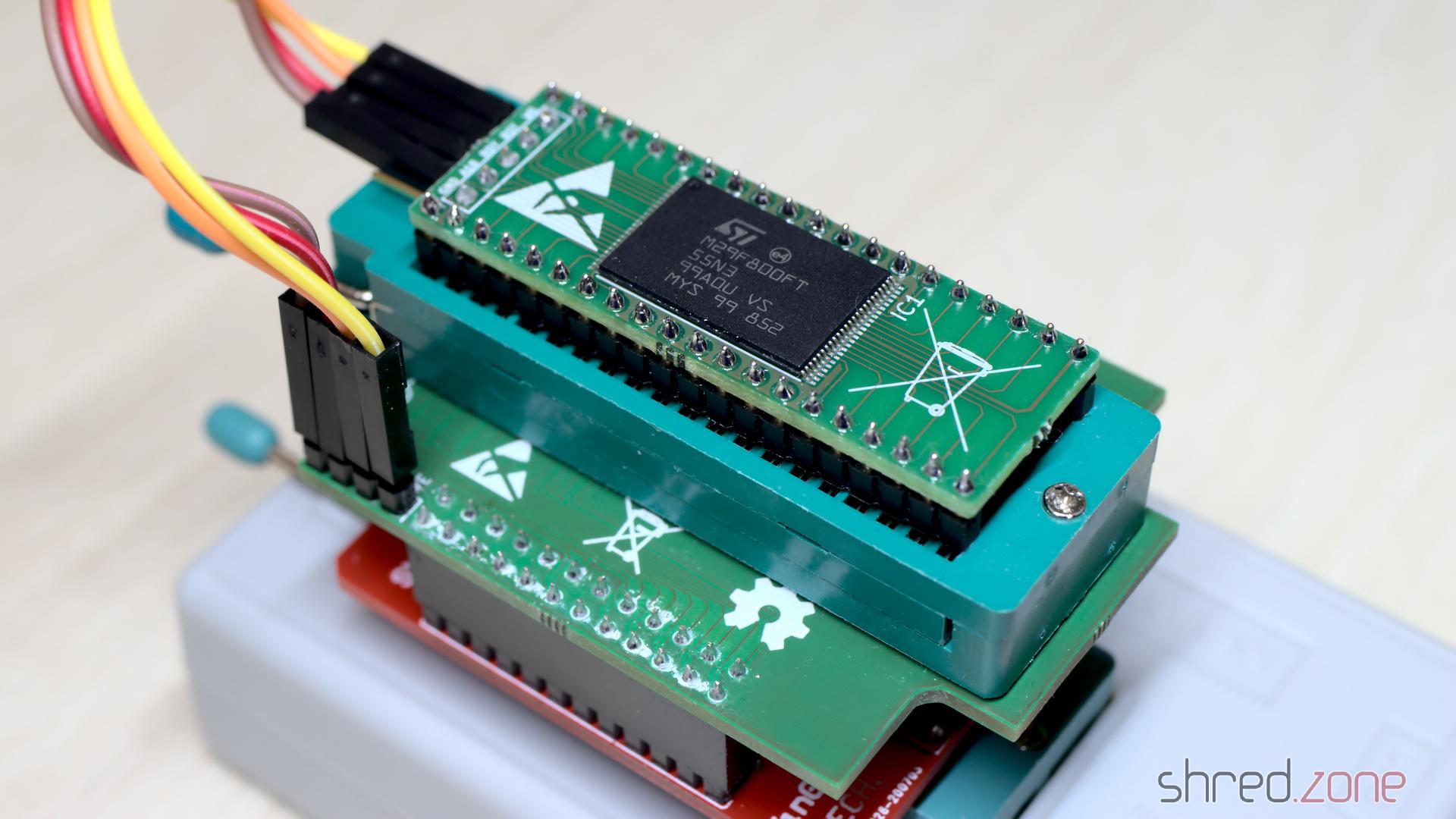 Wenn du nicht vorhast, den Flash-ROM-Inhalt nach dem Löten zu ändern, kannst du dir auch den Programmieradapter sparen und stattdessen den SN003-Adapter verwenden (der oft dem SN001-Adapter-Kit beiliegt). Du würdest das Flash-ROM dann vor dem Löten flashen.