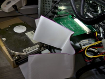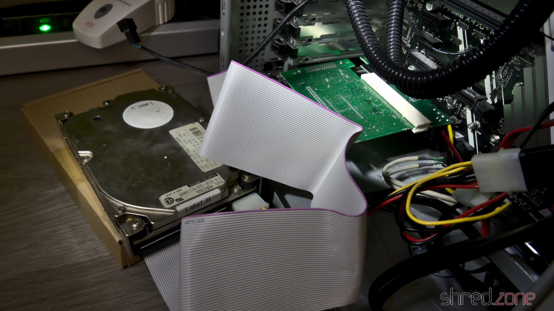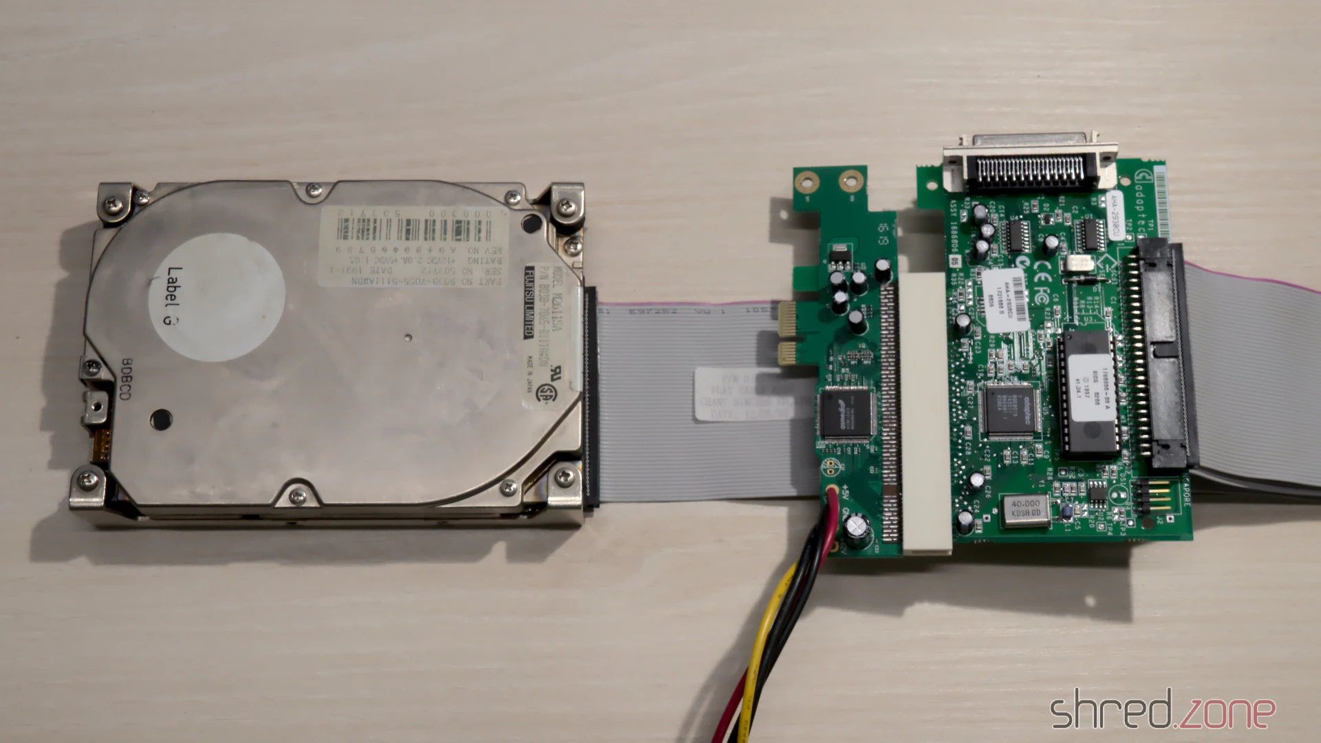 Heute erweist sich diese SCSI-Affinität jedoch als Problem. SCSI war bei Consumer-PCs nie ein Thema, daher gibt es keine SCSI-zu-USB-Adapter auf dem Markt (ich wünschte, es gäbe welche), und SCSI-Karten für den PCIe-Bus sind sehr teuer. Ich habe immer noch eine Adaptec SCSI-Karte in meinem Schrank, die ich vor vielen Jahren gekauft habe, aber sie ist für den alten PCI-Bus. Zum Glück gibt es PCI-zu-PCIe-Adapter auf dem Markt, sodass ich diese alte Karte in meinem Computer wiederverwenden konnte. Der Kartenstapel sieht abenteuerlich aus, aber für ein paar Stunden Betrieb zur Datensicherung reicht es.