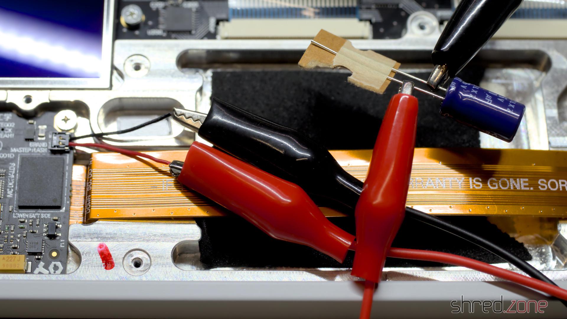 Ich startete ein Experiment. Anstelle eines Akkus verwendete ich einen Elektrolytkondensator. Der erste, den ich in meiner Bastelkiste fand, war ein 470µF 35V Typ, und ich schloss ihn mit Krokodilklemmen an den Akkuanschluss an.