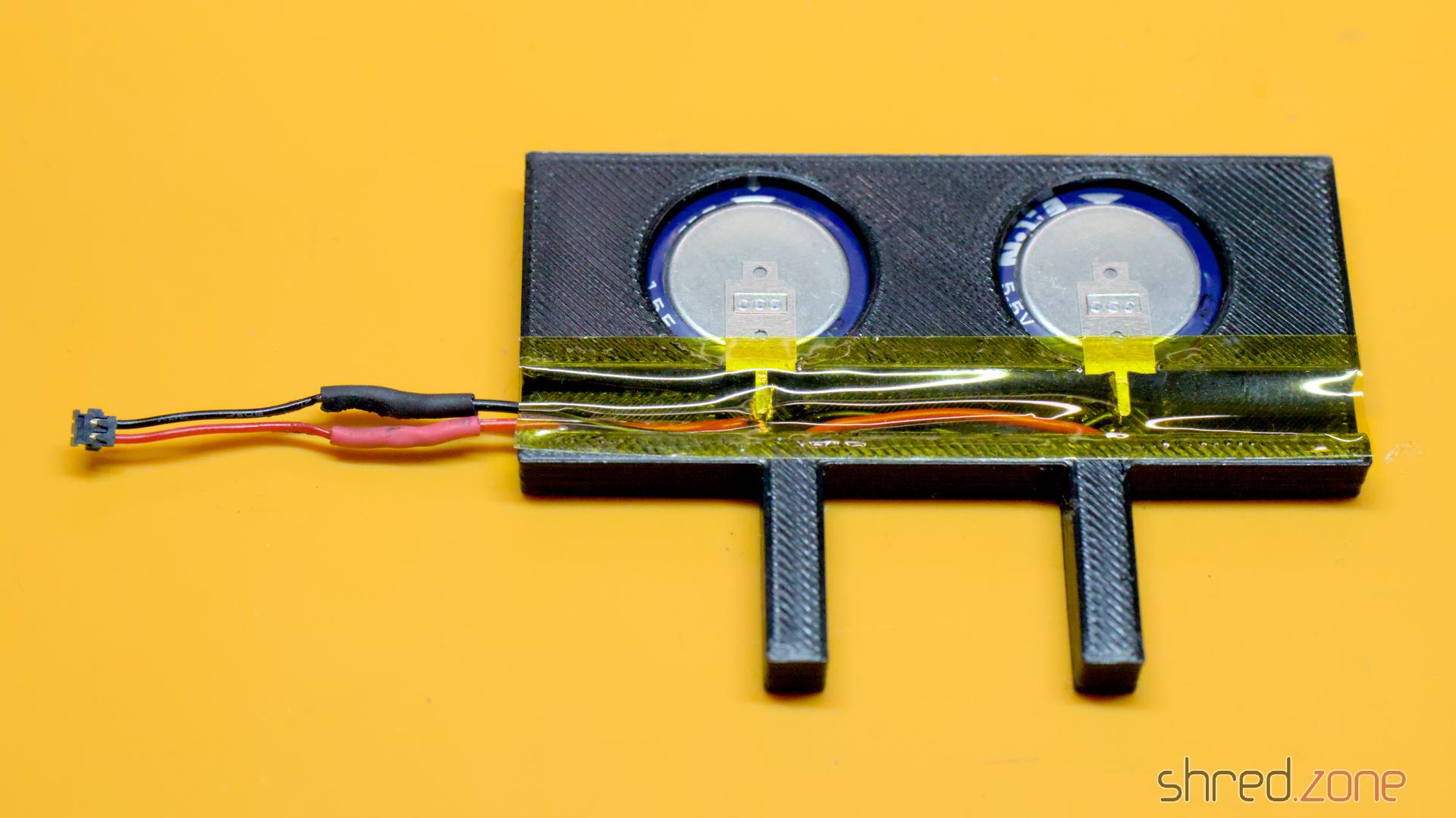 Ich habe einen Rahmen für die Kondensatoren in 3D gedruckt und ihn in den Platz des ursprünglichen Akkus gesetzt. Da das Gehäuse aus gefrästem Aluminium besteht, ist es wichtig, auf eine ordnungsgemäße Isolierung zu achten! Die Unterseite meines Rahmens ist aus diesem Grund massiv.