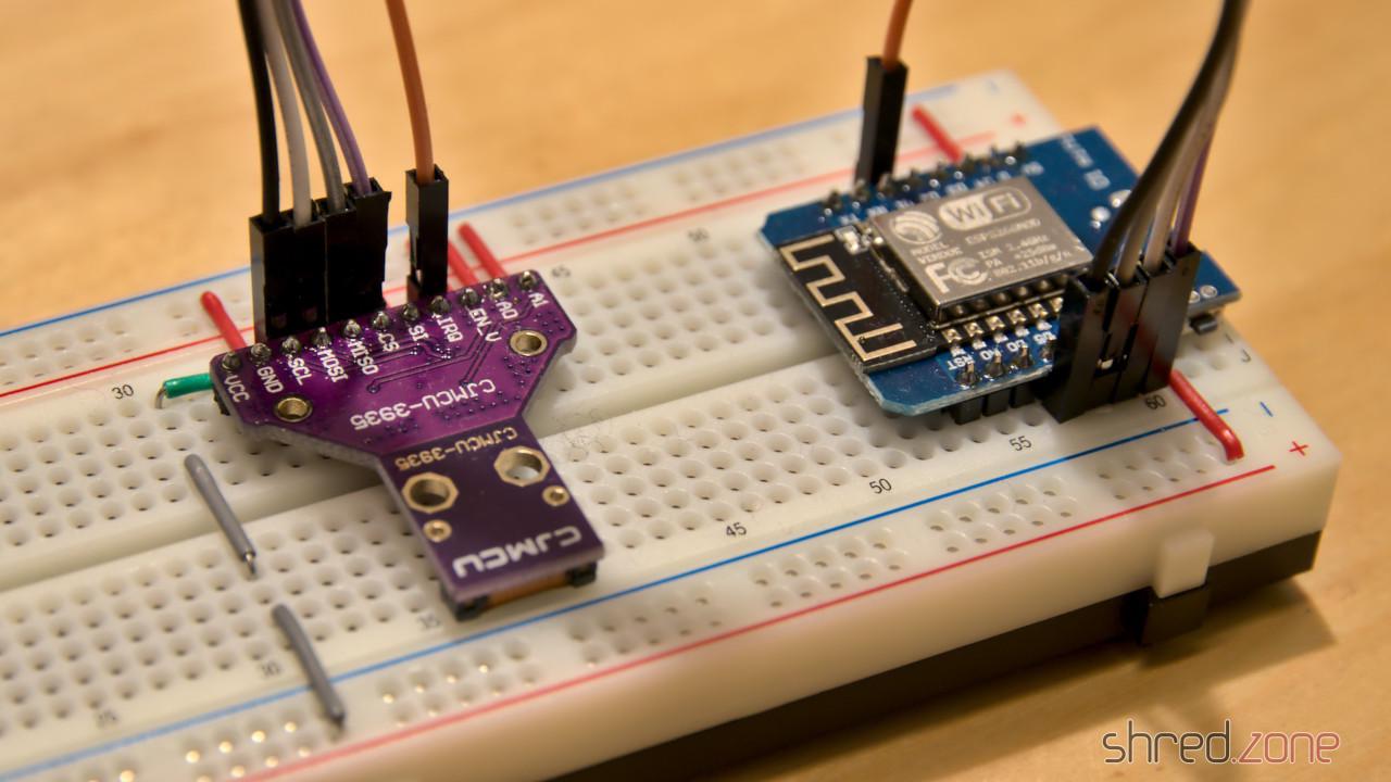 The sensor module can be found at many online shops selling products from China. It is not really cheap, but still affordable. I decided to use an ESP8266 as microcontroller, so I can read the sensor data by WLAN. The sensor is connected to the ESP via SPI. There was also some space left for a SK6812 RGBW LED indicating the sensor status.
