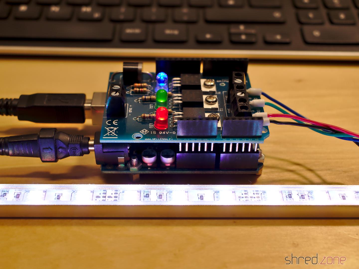 - Velleman KA01 RGB shield. Any other RGB shield or a self-made solution should work as well, maybe with some minor modifications to the code.