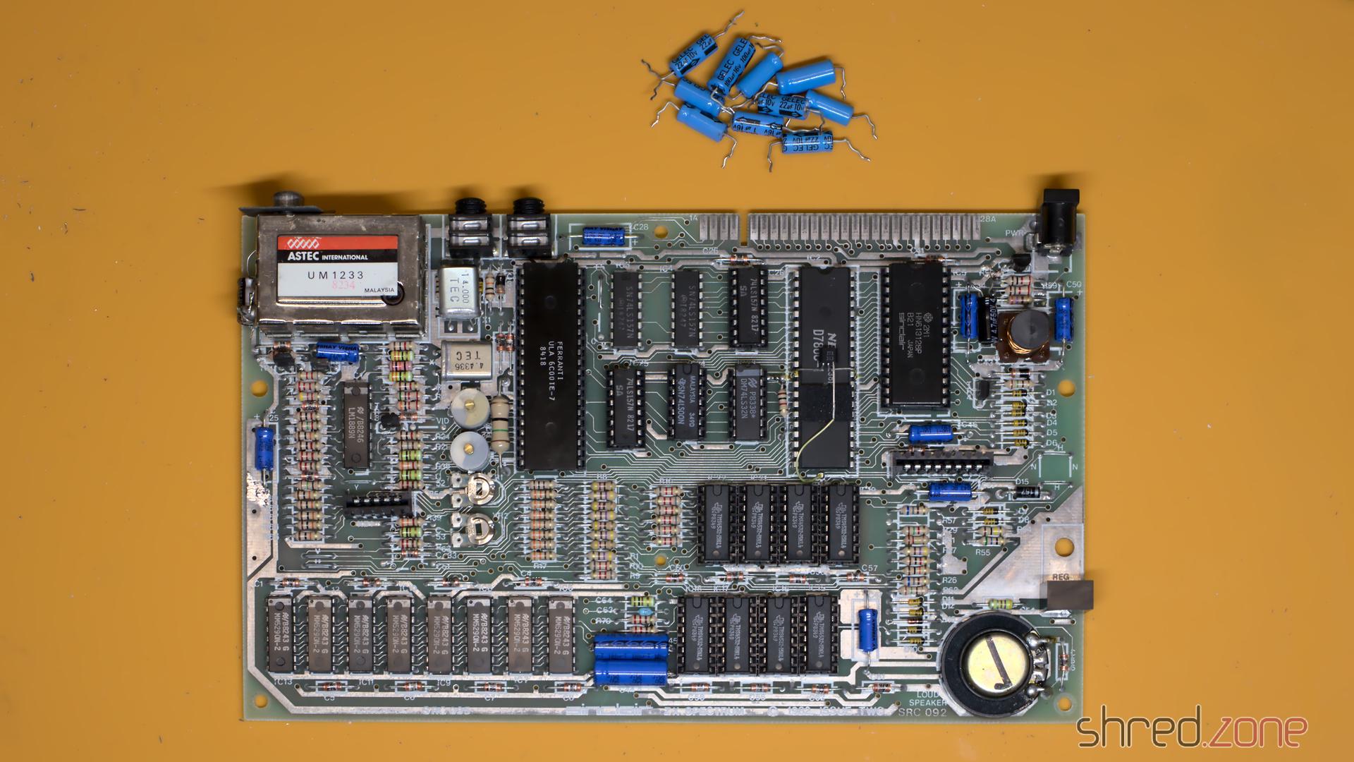 As there are no electrolytic capacitors on this board, there is no need for recapping. I still did a minor modification: I replaced the LEDs with blue (power) and red (disk) ones, as it became a kind of signature color for all my computers.