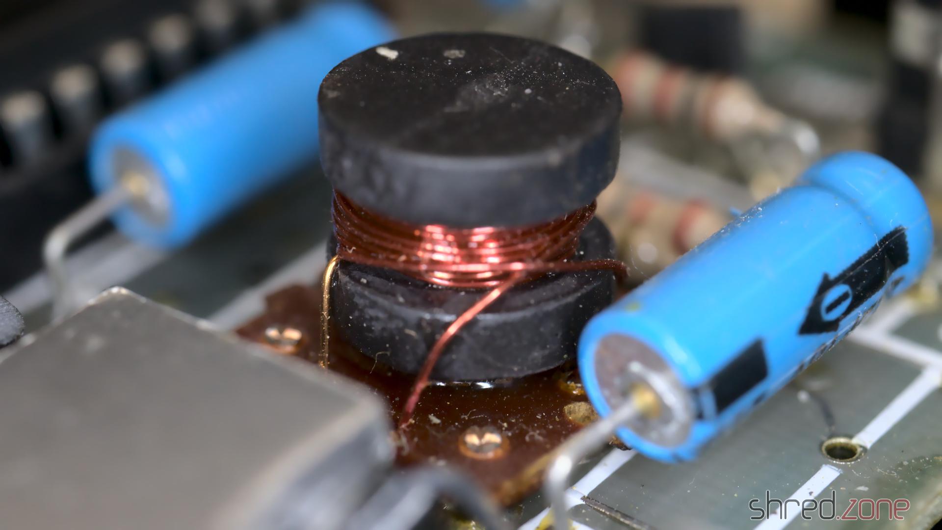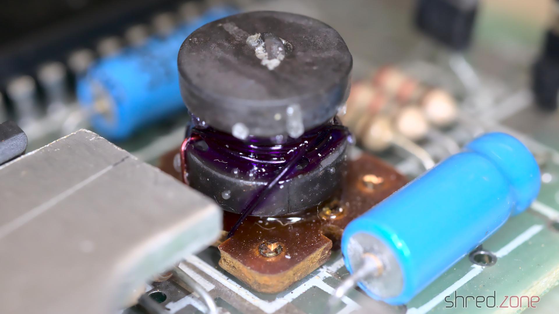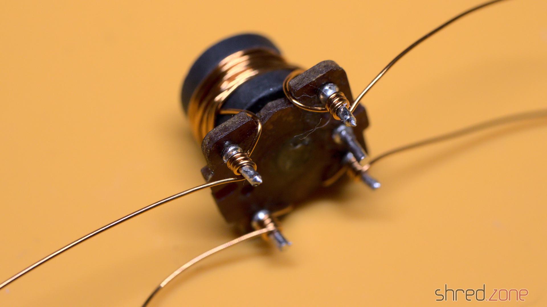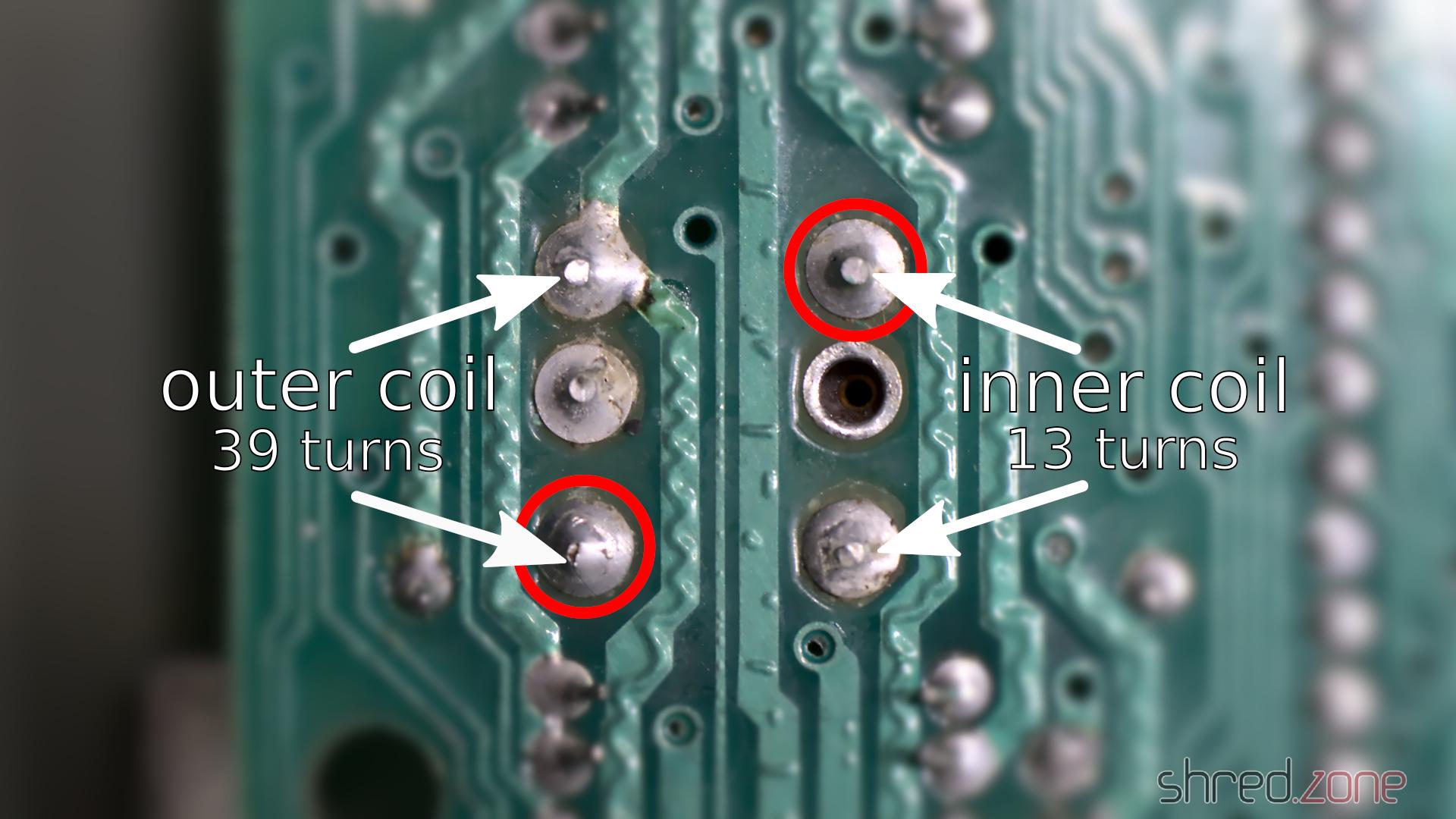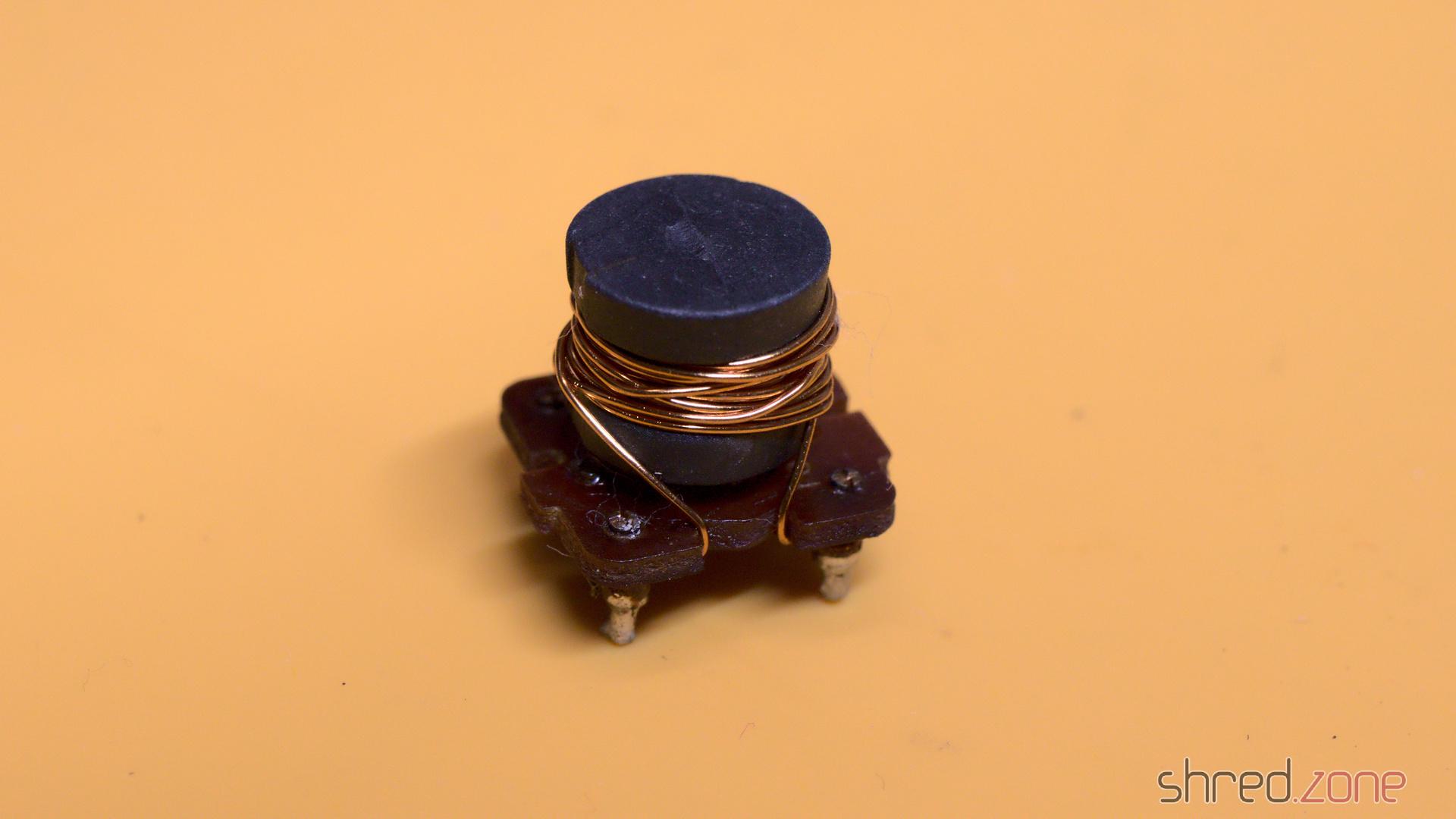 First we start with the inner coil. Wind a bit of the wire firmly around the pin marked in red on the next photo, then do 13 turns around the ferrite core, then wind the wire firmly to the other pin. The windings on the ferrite won’t need to be perfect, but should still be as tight as possible. I recommend to rewind the inner coil even if it appears to be intact, as the insulation might already be damaged.