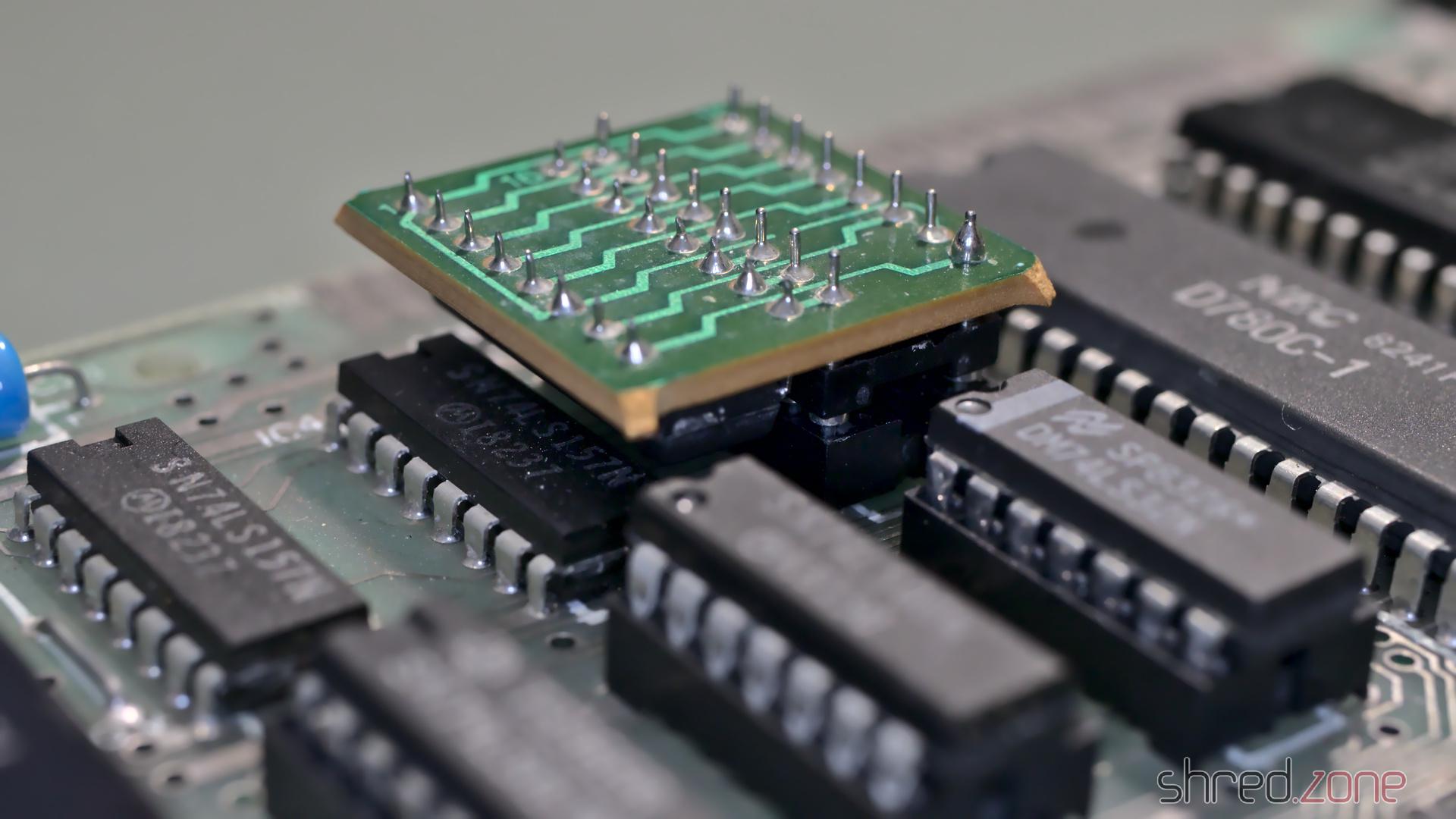 To install the adapter, the Denise chip is removed from its socket first. Then the adapter is placed into the socket, and Denise into the adapter. A button can be connected for changing the configuration and taking screenshots, but that is not really required for operation.